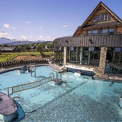 geotermalną. W skład atrakcji wchodzą masaże wodne,leżanki powietrzne, gejzery, sztuczna rzeka oraz dwiema zjeżdżalniami o długości 12 i 60m.